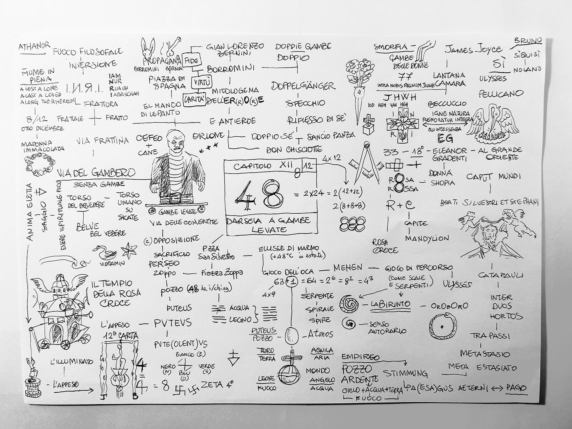 J.A. SCOTTO: Sono tutto questo e nulla di tutto ciò, come ogni simbolo che si rispetti. Gli elementi esoterici creano un ulteriore piano di lettura, una “ulteriore chiave di (meta-)letteratura”. Non sono solo decorazioni visive o allusioni simboliche fine a sé stesse; sono “legami esoterici, magici ed occulti, profondi, sovrapposti su più rimandi” che risuonano con l’idea di un “Mondo” complesso, stratificato, dove la realtà non è mai univoca, non è ciò che autodefinisce. Per MiMMo, questi simboli fanno parte dell’Alfabeto del Cosmo (la grande “O” del Grande Raccordo Anulare”, la “M” della Metro e di Mario Monicelli, che incontra a Cinecittà, …), e non solo del suo “pensiero magico” e della sua ricerca di significato nel caos. Il numero 888 stesso, che ricorre nelle pagine, nelle tre ottave dei 24 capitoli, e nel nome legato a Gesù (Jesus è il suo nome: J.A. Scotto) , è un riferimento numerologico legato alla gematria che invita a cercare connessioni nascoste. La menzione di RosaCroce e Fibonacci suggerisce l’esistenza di ordini sottostanti, schemi universali (matematici, mistici, iniziatici) che strutturano il Mondo della MetaMateMatica (con le sue tre M). Sono indizi che il lettore può cogliere o ignorare, a seconda della sua volontà di immergersi nella complessità. Fanno parte dell’«andirivieni nello spazio senza il divenire», del tentativo di dare forma all’informe, al multiforme e all’informale, all’assurdo. Sono parte della texture narrativa, e non solo del testo.